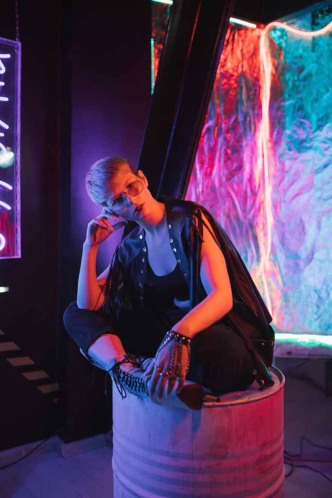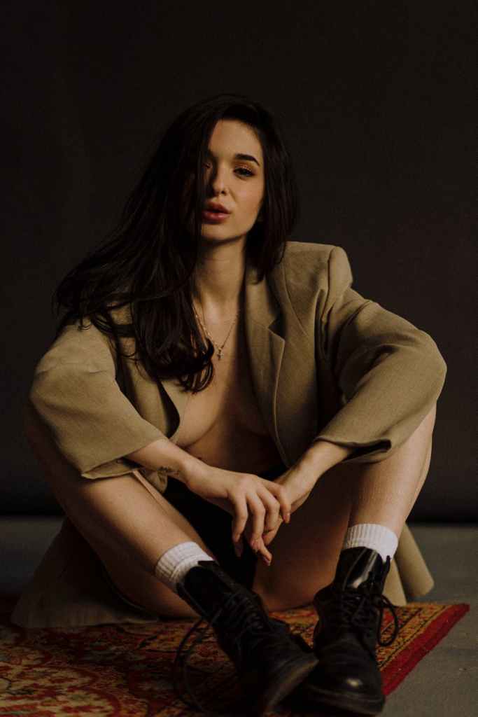 Alright what is this photo telling you. There is a story here. In every article of clothing and in the very way she leans at an angle toward the camera. The gaze. The expression of one eye brow raised.