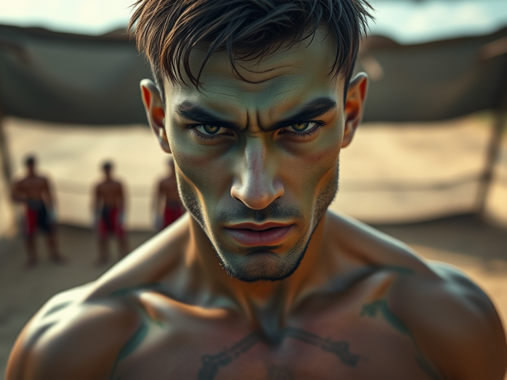 “Welcome heroes. I am Sargent Zed Jai. I am your trainer. I will teach you to fight and survive in the world once you leave for your journey after three months. Today we will celebrate you’re arrival here. But first a demonstration of what you will learn to master.” He said in a friendly voice and clapped his hands like a king. He summons two young male muscled warriors with slave collars around their necks. They were naked from the waist up both wearing leather shorts and no bare foot. They walked toward the fighting ring. They wooden swords in their hands and lines of scars on their backs and arms. They got in the ring and quickly started to fighting it out with brutal fast force.